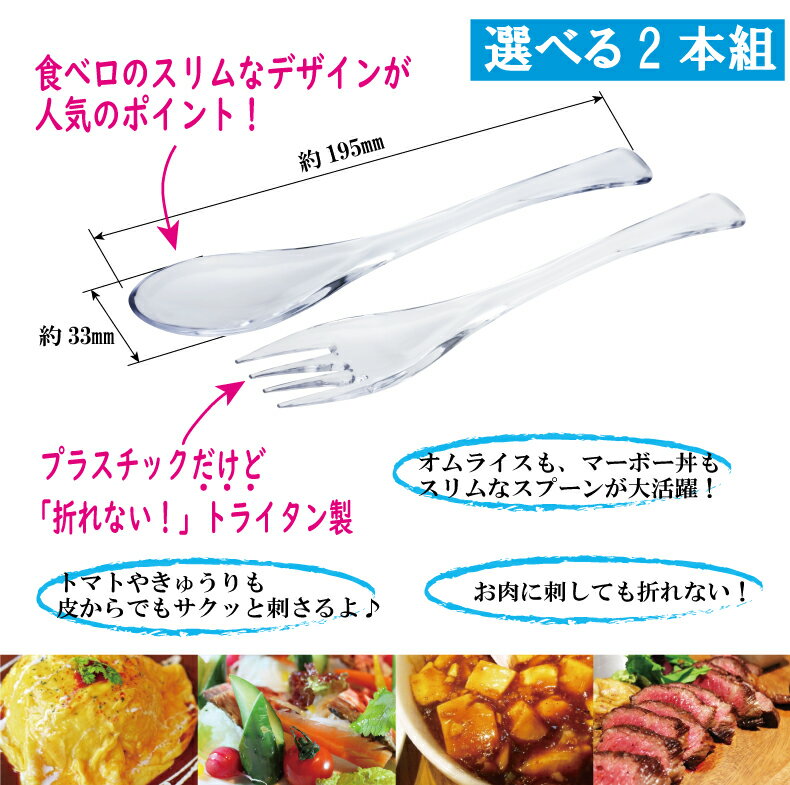 商品名 トライタン スリムスプーン&フォーク 商品説明 タンブラーで好評を頂いている、食洗機・漂白剤・アルコールOKのプラスチック「トライタン」を原料としているシリーズから新作登場! お子さまや女性にも嬉しい細身のスプーン フォークは、お肉に刺しても折れません。