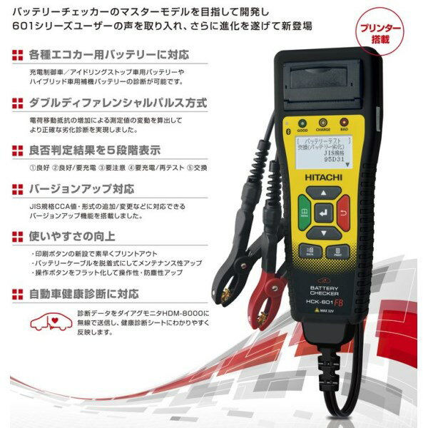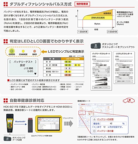 **************************************** ●表示部:(LCD)ドット表示(128×64ドット) ●表示可能エリア:L27.5mm×W55mm ●LCDタイプ:COG ●表示&印字言語:日本語、英語 ●Bluetooth潤・ハ信:Bluetooth潤・er2.1+EDR対応(Class2)SPP ●通信距離:約10m ●電源供給:テストバッテリー(動作電圧DC8V~32V)、USB-miniBコネクタ(DC5V) ●24Vバッテリー: エンジン始動能力/チャージングシステムテストのみ対応※バッテリーテストは12Vバッテリー単体ごとに行うことで可能 ●測定バッテリー種類:12V鉛バッテリー全般 ●測定バッテリー規格:JIS、EN(DIN)、SAE(BCI) ※CCA入力、産業用の選択可 ●使用温度・湿度:0~50℃、80% rh以下(ただし結露のないこと) ●保存温度・湿度:-20~60℃、70% rh以下(ただし結露のないこと) ●寸法:248mm(L)×96mm(W)×55mm(D)(ケーブル&ブッシュ含まず) ●質量:約670g(プリンター用紙含まず) ●バッテリーケーブル長:約70cm(クリップ&ブッシュ含まず) ●〔付属品〕USBケーブル、取扱説明書、キャリングケース、プリンター用紙2本(1本は本体内に格納済)**************************************** 「共通の送料込みライン」に伴う対応に関しまして いつも弊社をご利用頂きまして誠に有難うございます。